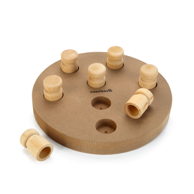 Das Beeztees Braingame Giono fordert deinen Hund auf spielerische Weise physisch und mental heraus, da er hier auf der Suche nach den versteckten Snacks verschiedene „Hürden“ überwinden muss. Giono kann auf beiden Seiten bespielt werden, so kannst du euer gemeinsames Spiel abwechslungsreich gestalten. Auf einer Seite muss dein Hund die Schieber mit seiner Pfote/ Schnauze bewegen, um an die Leckereien heran kommen zu können, auf der anderen Spielseite muss dein Hund dazu die Holz-Hütchen entfernen. Wenn du jedes Mal andere Verstecke wählst, bleibt das Spiel für deinen Hund spannend und interessant.