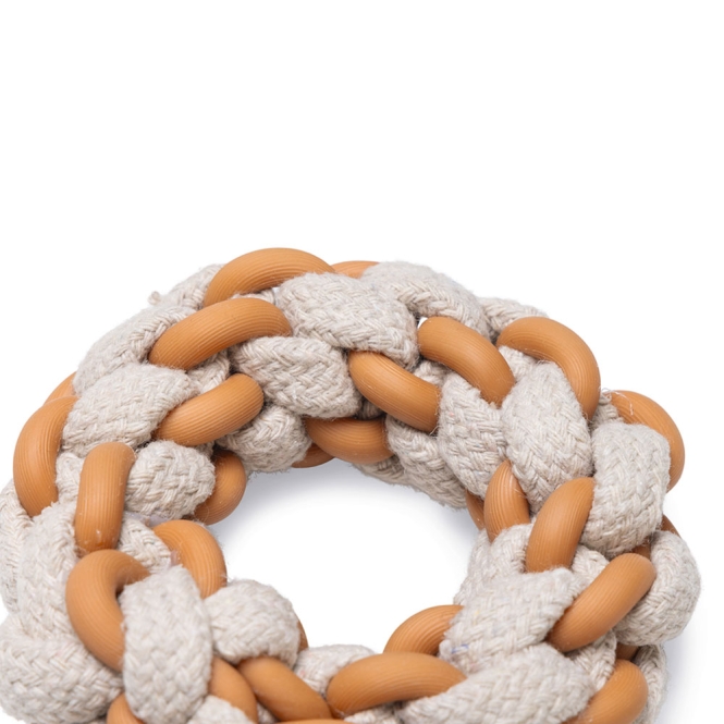 Mit dem Beeztees Puppy Dental Seilring Mik schenken Sie Ihrem Welpen ein Spielzeug, das nicht nur Freude bereitet, sondern auch die Maulhygiene unterstützt. Der Ring besteht aus einer Kombination aus TPR (thermoplastischem Gummi) und Baumwolle, was ihn besonders elastisch macht und beim gemeinsamen Spiel für zusätzlichen Spaß sorgt. Dieses speziell entwickelte Welpenspielzeug reinigt die Zähne und massiert das Zahnfleisch während des Kauens. Die weiche, zugleich robuste Struktur stillt das Kaubedürfnis Ihres Welpen und kann helfen, Zahnwechselbeschwerden zu lindern.