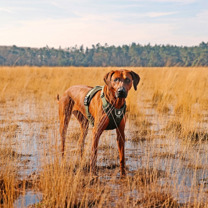 Mit dem EXPLOR Ultimate Fit No-Pull-Geschirr, einem gut durchdachten, ergonomischen Hundegeschirr, das ideal für einen täglichen Stadtspaziergang oder auch ein großes Outdoor-Abenteuer ist, sind Sie unterwegs immer auf Tuchfühlung. Ihr Hund genießt optimale Bewegungsfreiheit, weil der durch Ziehen an der Leine verursachte Druck gleichmäßig über die Brust verteilt wird. So werden lebenswichtige Organe im Nacken geschützt. Das Geschirr verfügt über zwei Befestigungsringe aus Edelstahl: einem auf dem Rücken, der für ruhige oder ältere Hunde geeignet ist, die leicht zu kontrollieren sind und einem verstärkten D-Ring im Brustbereich, um Hunde, die an der Leine ziehen, zu kontrollieren. Das EXPLOR Ultimate Fit No-Pull-Geschirr ist um den Nacken und die Brust herum verstellbar, wodurch es, in Kombinatin mit den stapazierfähigen Materialien, für fast alle Hunde geeignet ist. Die Schnallen sind um die Mitte herum angebracht, so dass der Hund kein(e) Bein(e) anheben muss, wenn das Geschirr angelegt wird. Um das Fell und die Haut des Hundes vor Wundscheuern zu schützen, sind die meisten der Riemen und Schnallen mit weichen, atmungsaktiven Materialien überzogen. Außerdem trocknen die leichten, aber hochwertigen Stoffe, die sowohl für die Innenseite als auch für die Außenseite verwendet werden, schnell, was sehr praktisch ist, wenn Ihr Hund gerne schwimmen geht. Um zu verhindern, dass sich Ihr Hund beim freien Laufen an Ästen verfängt, hat das Geschirr keine Schlaufen oder abstehenden Teile. Das EXPLOR Ultimate Fit berücksichtigt auch die Sicherheit Ihres Hundes im Straßenverkehr. Die reflektierenden Paspeln sind an den richtigen Stellen angebracht und sorgen für optimale Sichtbarkeit im Straßenverkehr. Außerdem gibt es im Brustbereich des Geschirrs eine spezielle Innentasche für einen ID-Anhänger, so dass der Anhänger  leicht zugänglich und unbeschädigt bleibt. Rausgehen und ERKUNDEN!