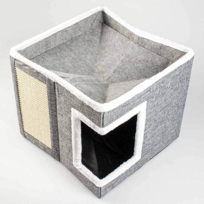 Das Katzenkratzhaus Gaby von duvoplus ist ein gemütlicher und sicherer Rückzugsort für deine Katze. Das Häuschen ist faltbar und hat eine eingearbeitete Sisal-Kratzmatte. Es hat 2 Liegeflächen und ist mit weichem Plüsch und einem herausnehmbaren Kissen ausgestattet. Gaby ist kompakt und passt daher überall leicht in dein Zuhause.