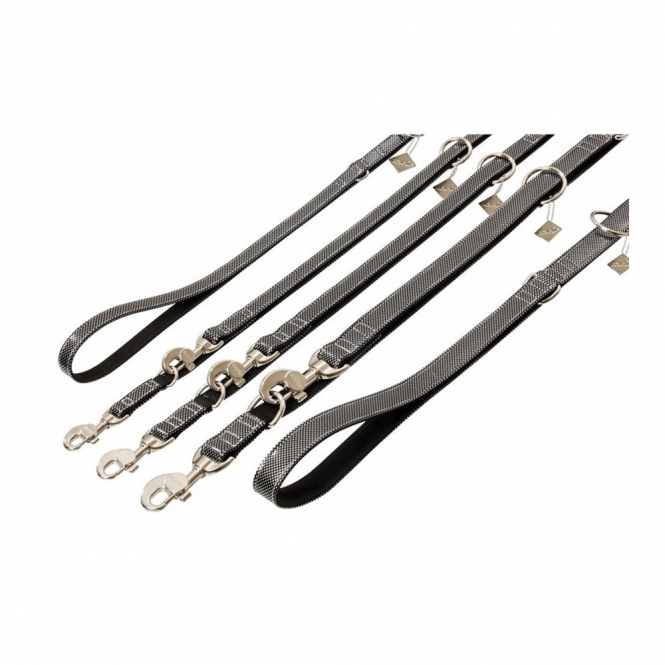 Die Buffalo Ultra Black & White Halsbänder und Leinen sind mit Büffelleder unterlegt, wasserabweisend und genäht. Die Karabinerhaken bestehen aus Aluminium.