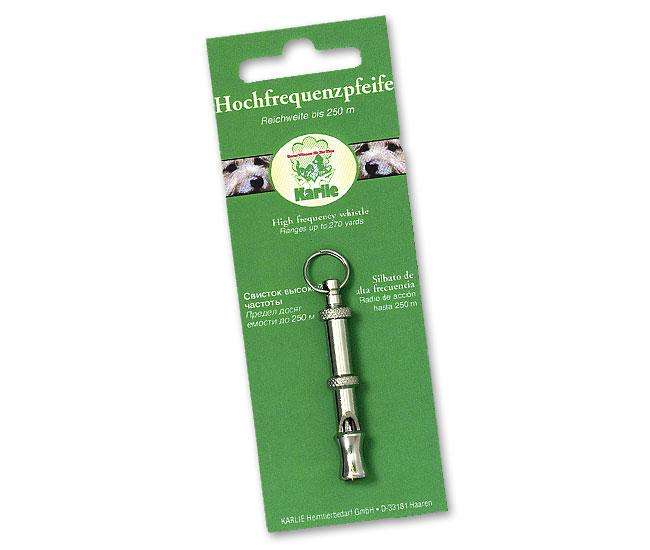 Pfeifen unterstützen ein neutrales Training, da Emotionen nicht über eine Pfeife übertragen werden. Metallpfeifen gibt es in verschiedenen Ausführungen: als Hochfrequenzpfeife oder Trillerpfeife. In der Ausbildung von Hunden sehr beliebt sind Hochfrequenzpfeifen. Für den Hund sind hohe Frequenzen wesentlich besser zu hören als für den Menschen. Auch ist ein Ton aus dieser Pfeife immer ein eindeutiges Signal, anders als bei einer Stimme, die immer wieder anders klingt. Ein weiterer Vorteil für den Einsatz dieser Pfeife besteht darin, dass die Umgebung nur wenig gestört wird. Die Frequenz ist einstellbar. Robuste Metallausführung.