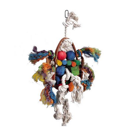Dieses Papageien-Spielzeug besteht aus verschiedenen Elementen aus buntem Holz, Leder und Seil.