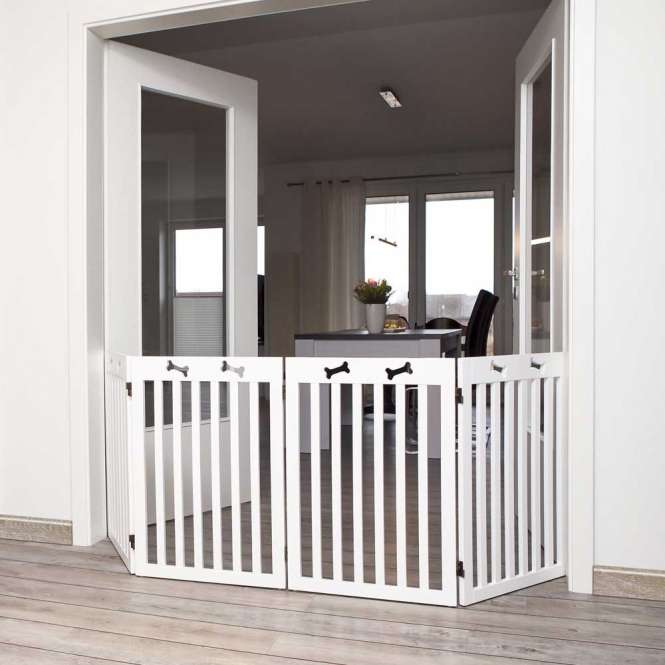 Dieses hochwertige Hunde-Absperrgitter besteht aus lackiertem MDF und ermöglicht es Ihnen Räume, Treppen etc. auch für große Hunde abzusperren.