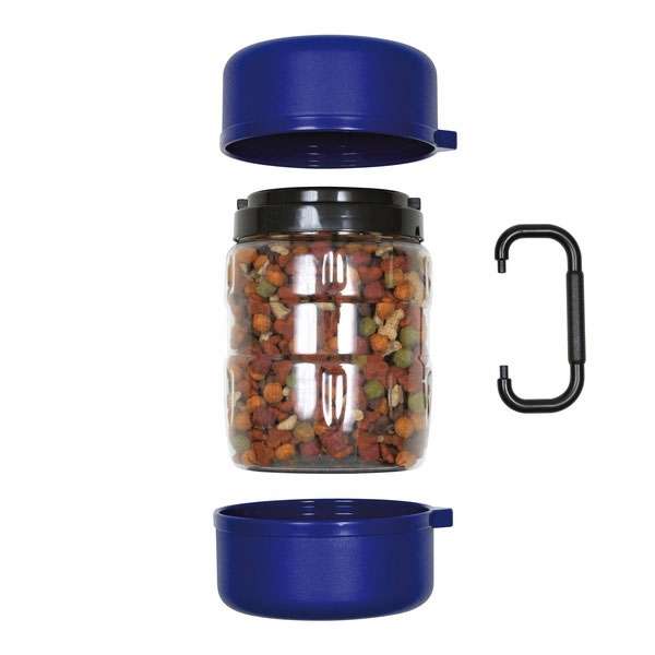 Das Set besteht aus einem Wasser- und einem Futternapf je 0,75 l und einem Futterbehälter mit 2 l Fassungsvermögen zum Aufbewahren des Trockenfutters. Die Einzelteile werden zum Transportieren einfach zusammengesteckt und können so platzsparend verstaut oder mit Hilfe des Griffs getragen werden.